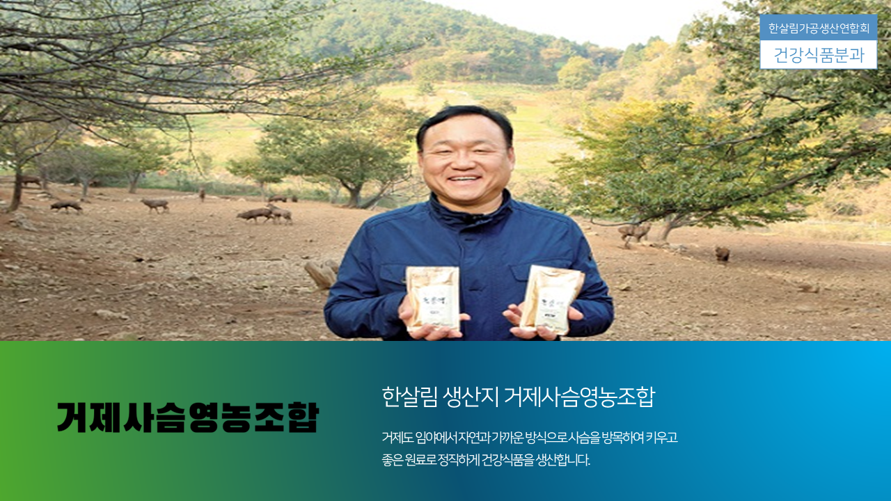 거제사슴영농조합 건강식품분과 hansalimpp — 2023년 05월 10일 · 0 Comment 누구나 안심하고 먹을 수 있는 식품, 안성식품이 만듭니다. 회사명 : 거제사슴영농조합법인 대표자 : 김수민 소재지 : 경남 거제시 거제면 옥산금성길 23 직원수 : 38명 설립일 : 2003년 2월 17일 매출액 : 104.4억(2022년 기준) 주요사업 : 축산물가공, 건강보조식품 대표제품홍삼절편(20g*10개)6년근 홍삼에 한살림 아카시아꿀을 더해 만든 ‘홍삼절편’ 꽃사슴녹용액(남성/60봉*90ml)꽃사슴 녹용과 국산 6년근 홍삼, 10여 가지 국산 약재를 정성껏 달인 ‘꽃사슴녹용액’ 수리싹(20g×10개)국산 아스파라거스, 헛개, 새싹보리를 간편하게 젤리로 '수리싹' 마시는석류(100ml*10병)국산 석류를 통째로 추출한 ‘마시는석류’ 홍진단(선물용/4.2g*10환)동의보감에 수록된 귀한 원료에 6년근 홍삼을 더해 정성껏 만든 '홍진단'